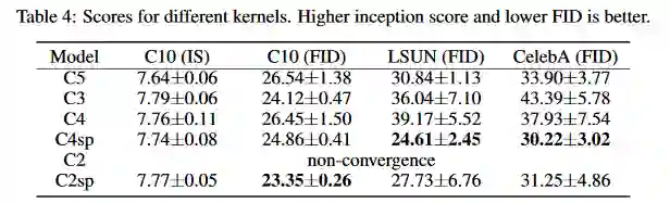 在图像生成任务中,C2sp和C4sp都可以提高图像质量并稳定收敛。具有对称填充的偶数大小的卷积核为强调在线和持续学习的CNN体系结构设计提供了更有效的结构单元。