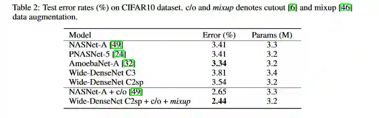 同时论文对比了C2sp和当前的一些NAS网络模型:NASNet,PNASNet和AmoebaNet等。论文应用Wide-DenseNet并调整深度和宽度(K=48,L=50)以具有大约3.3M参数。和SOAT的自动生成模型相比,C2sp的准确率损失了不到0.2%,并且使用cutout和数据增强策略后模型的准确率相比SOAT精度还可以提升0.21%。