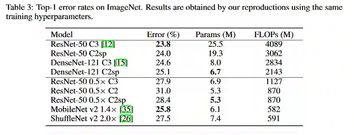 各种实验表明 C2sp 是对 C3 的有效分解,并可节省 30%-50% 的参数和 FLOPs。另外,和紧凑的 CNN 模块 (如 DWConv, ShiftNet, 倒瓶颈结构 (MobileNetv2 引入)) 相比,C2sp 在训练过程中具有 20% 的加速比和 35% 的内存节省,并且达到和他们类似的精度。在生成对抗网络中,C2sp 和 C4sp 都获得了改进图像质量和收敛更加稳定的效果。
