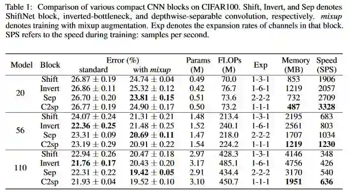 这一节和当前在模型结构方面设计的一些高效CNN模块如Shift Net, 深度可以分离卷积,反瓶颈结构(Mobilenetv2引入)进行对比。主要对比了错误率,参数量,FLOPs,通道扩展速率,内存,速度等指标。具体的测试结果如Table1所示。