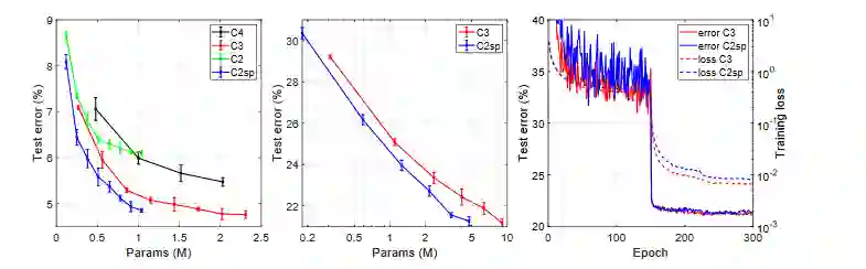 为了探索各种卷积核的泛化能力,这里选择没有瓶颈层的ResNet作为主干网络。并且将所有其它组件和训练超参数保持相同,仅仅将每个C3替换为C4,C2,C2sp。在CIFAR10上训练深度为6n + 2,n∈{3,6,...,24}的网络。参数精度曲线如Figure3左图所示: