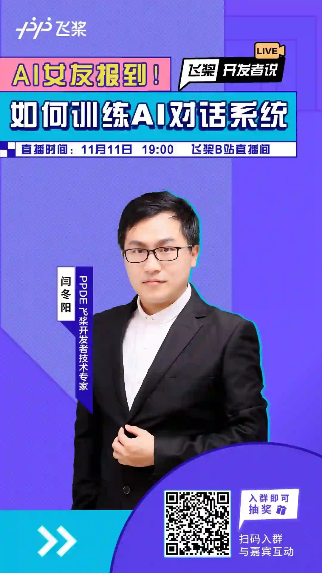 将通过开放域对话、百度Plato对话模型、训练模型数据准备、训练模型与并行运算、输出模型与测试、巧用官方模型的魔改之路等内容教会大家训练一个“AI女友”,并给大家演示最终结果。详情请关注下方海报,扫描海报中的二维码即可免费报名!