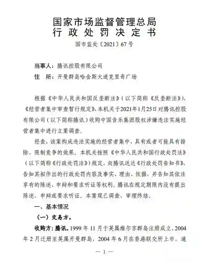 逐渐化身「托拉斯」级别的腾讯音乐集团,自然也引起了国内反垄断部门的重点关注。2021 年 1 月 25 日,国家市场监督管理总局开始对腾讯 2016 年 7 月收购中国音乐集团股权涉嫌违法实施经营者集中行为立案调查。