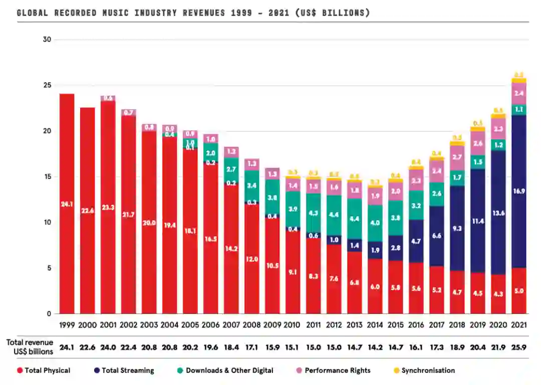 但在这之后它依然没有止步,继续大规模地蚕食其他类别的市场份额。尤其是在 2020 年新冠疫情以来,人们对音乐的需求进一步增加,在 2021 年更是带来了 3.3 亿美元的增长,遥遥领先其它类别。而且也正是这一年,有了流媒体音乐服务的加持,全球的音乐产业终于「重现了 1999 年的辉煌」。