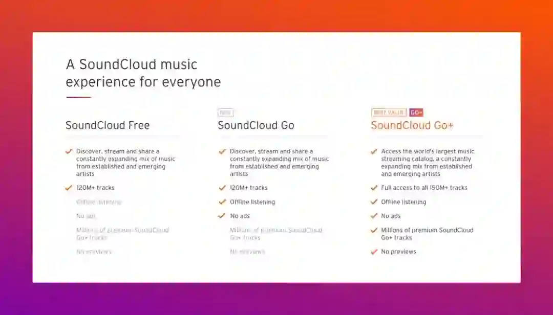 和其他流媒体音乐服务类似,订阅 SoundCloud Go 之后,便可以享受这些含版权音乐的无广告和离线播放功能。一年后,SoundCloud 又推出了 SoundCloud Go+ 订阅服务,拥有一个「高级会员专属曲库」。原有的 Go 则降级为基础版订阅服务,费用也降价到 5 美元每月。Go 订阅下无广告和离线播放依然可用,但遇到了高级会员专属曲库内的音乐就只能试听 30 秒。