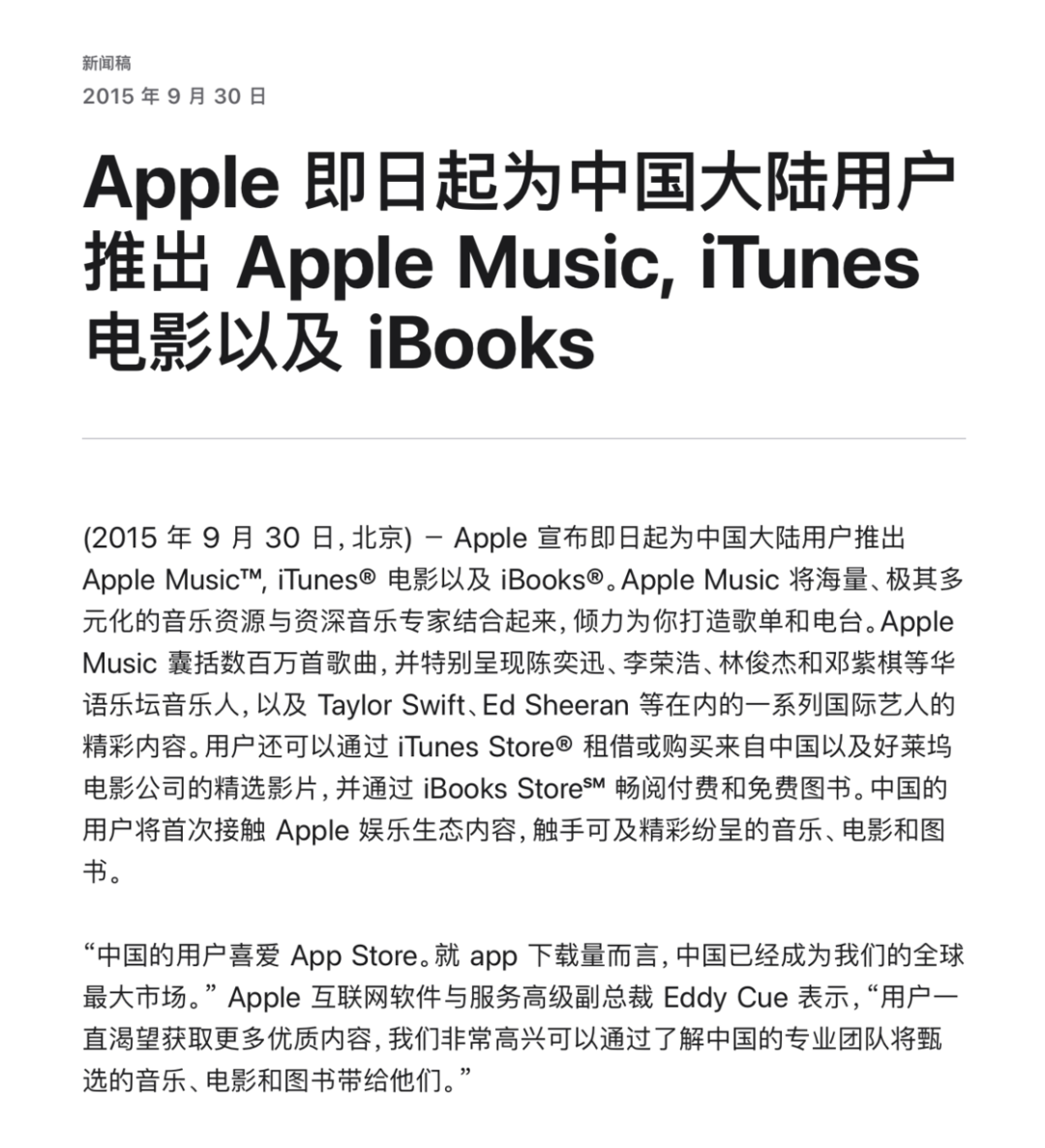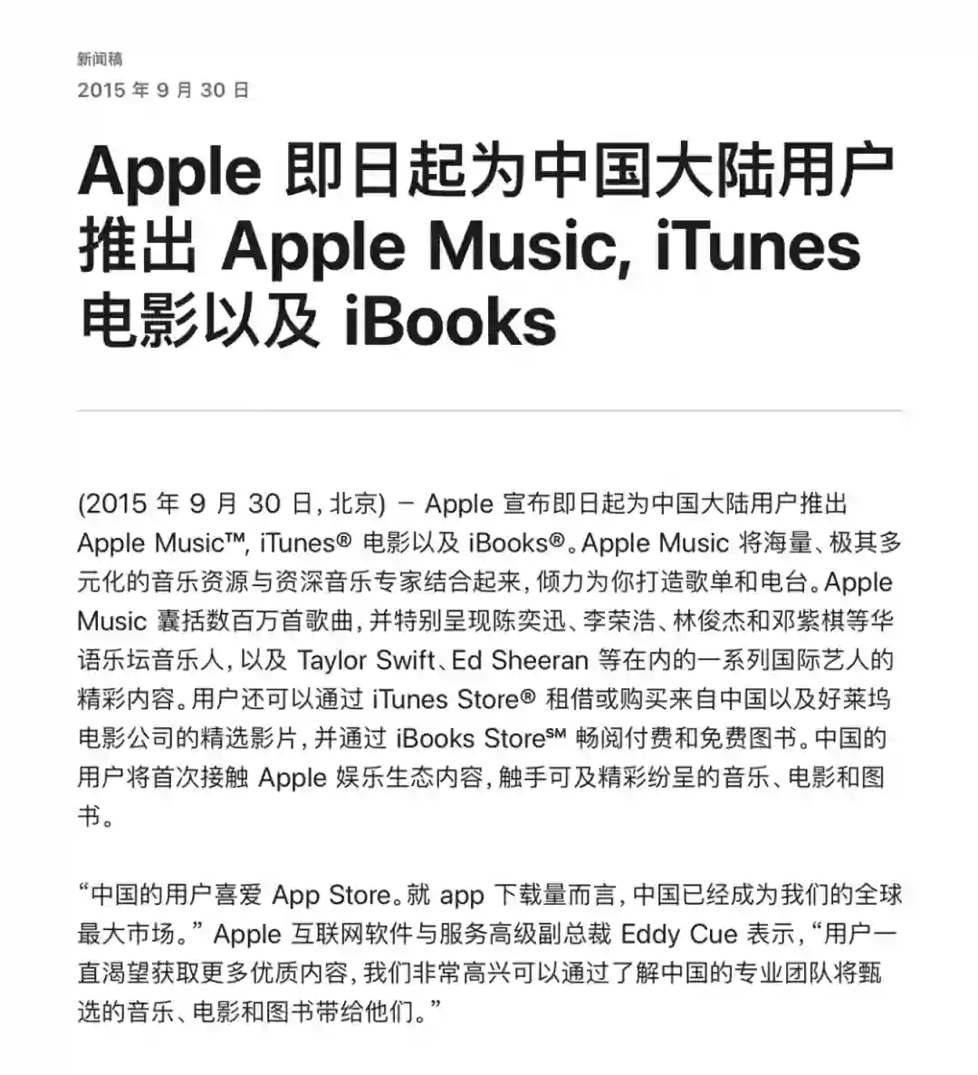尽管早期的 Apple Music 还存在一些同音乐版权公司和音乐人的拉扯,但很快便得到了解决。在这些公关事件下,Apple Music 的热度再度被炒高,也让世界看到了 Apple 恐怖的版权谈判实力和响应速度。在 Taylor Swift 等一众音乐人宣布将作品重新上架 Apple Music 后,便迅速进入了高速发展的阶段,在全球急速扩张,先后在多个国家上线服务,包括许多流媒体服务商垂涎却一直无法进军的中国大陆市场。
