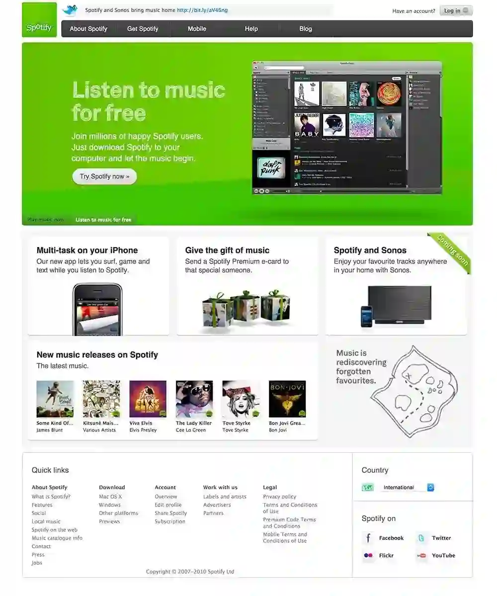 所以在一开始,Spotify 的努力方向其实和当时的各家都不太一样。虽然模式都相似,但 Spofity 重在体验,将在线听音乐时最大的痛点:传输速度,进行了重点提升,并且还设计了好看的官网。这就意味着,在它正式开始扩张向全球之前,在用户体验上就有了领先对手的实力。