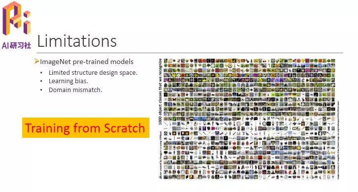 ImageNet预训练模型的限制:一是模型结构是固定的,你不可能改变它的结构,二是会有learning bias,三是会出现domain不匹配的情况。我们的思路是从头训练检测器,但是我们用R-CNN和Faster-RCNN都没能得到较好的表现。