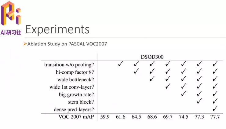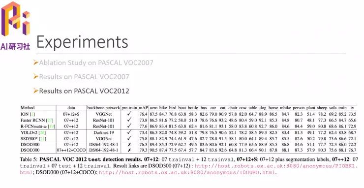 下面是在PASCAL VOC2012上的实验结果,可以看到DSOD有不错的mAP值。