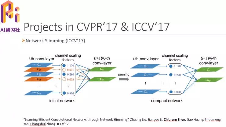接下来是我们在ICCV 2017上的工作,主要是做网络压缩。我们用了一个衡量channel是否重要的值来训练模型,然后剔除掉不太重要的特征层。论文代码我们也放在github上了。具体细节大家可以参见论文Learning Efficient Convolutional Networks through Network Slimming,论文地址:https://arxiv.org/abs/1708.06519