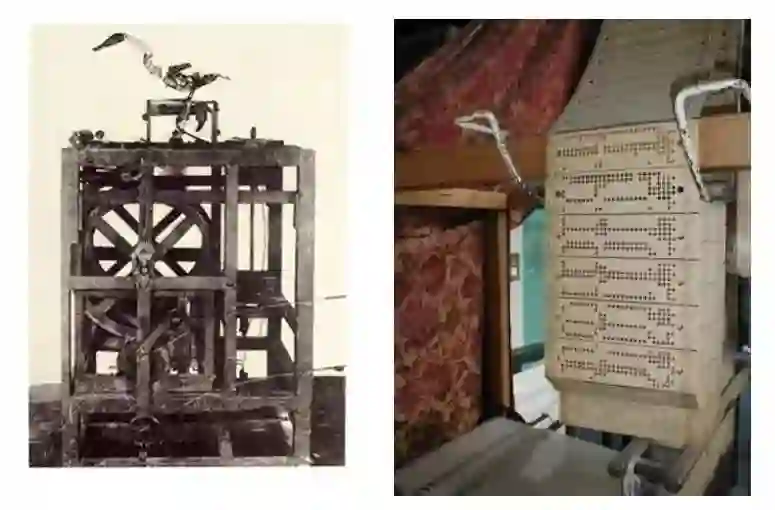 左图:消化鸭,右图:由消化鸭发明者设计的带有穿孔卡片的可编程织布机