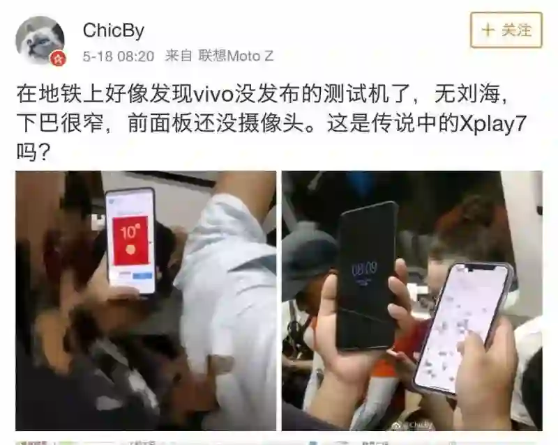 5 月 18 日早晨,微博网友@ChicBy 称在地铁上见到 vivo 尚未发布的测试机。这款测试机基本保留了 APEX 的 ID 风格,没有采用刘海异形屏,但要明显比后者的 R 角更大看起来似乎更加的圆润,屏占比也相当高,逼近 100%。网友怀疑这可能是即将发布的 vivo Xplay 7。