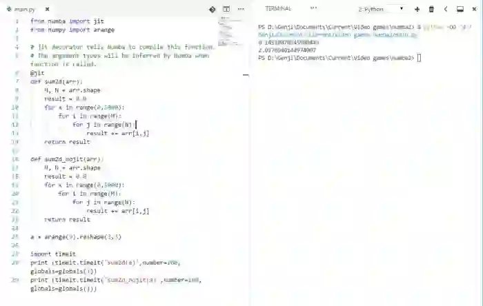 Numba 使用 LLVM 进行即时编译数字代码并加速其执行。JIT 加速过的 sum2d 函数的执行速度比常规 Python 代码快 139 倍。