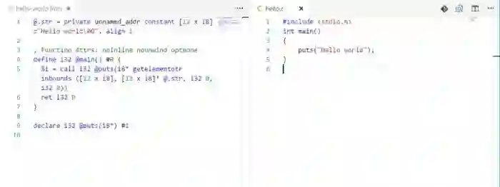 这是一个 LLVM 中间代理(IR)的例子。右边是一个简单的 C 程序;左边是由 Clang 编译器翻译成 LLVM IR 的代码。