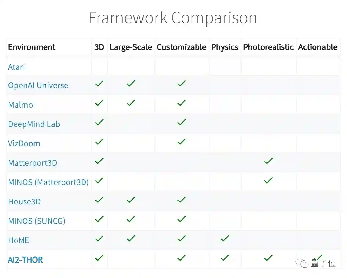 与同类框架相比,Agent可以操作场景中的物体,是AI2-THOR的一大亮点。它的真实性和对物理规则的整合,也是很少有框架具备的。