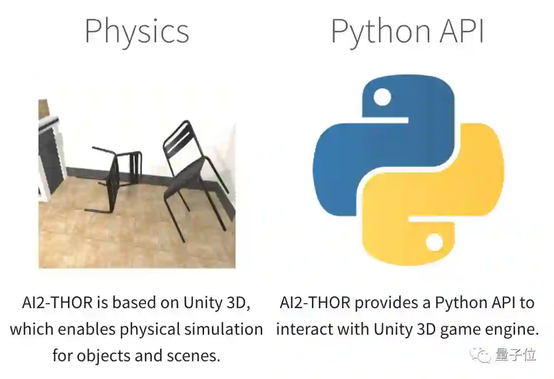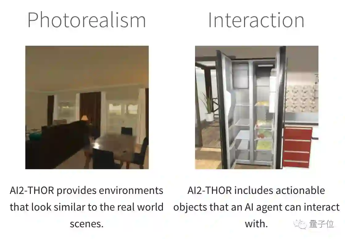 为了让Agent与场景的交互尽可能接近真实,AI2-THOR除了包含表面上能看到的高质量3D场景之外,背后还有Unity 3D引擎,能让其中的物体遵循现实世界的物理规则来运动,也就是让交互动作尽可能真实。