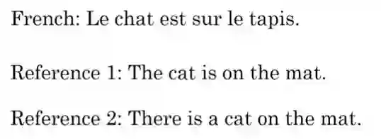 第一句是法语,需要把它翻译成英语;下面两个Reference句子是标准答案的参考(下面告诉你这个怎么用),最后一句就是机器翻译的句子。(举这个特例例子是也是因为会感受到机器学习评价算法的不断优化过程)