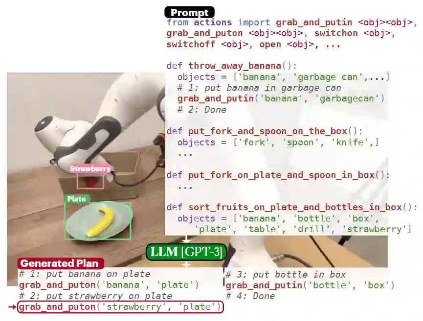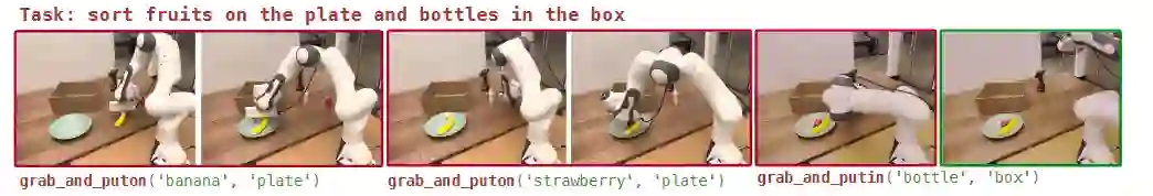 可以看到,机器人在分类任务中,能够识别出香蕉和草莓是水果,并生成计划步骤,将它们放在盘子里,而将瓶子放在盒子里。
