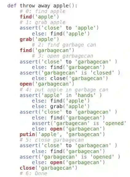 语言模型输出的计划中包含形式为grab和putin等函数调用。