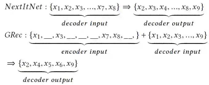 在介绍最终的解决方案之前,首先需要研究一些结合未来上下文的传统方法。然后,我们阐明了这些方法在用于生成任务时的潜在缺陷。在分析的基础上,我们提出了基于间隙填充(或填空)的编码器-解码器生成框架,即GRec。下面,我们将使用NextItNet中使用的扩展卷积神经网络实例化所提出的方法,同时考虑准确性和效率。