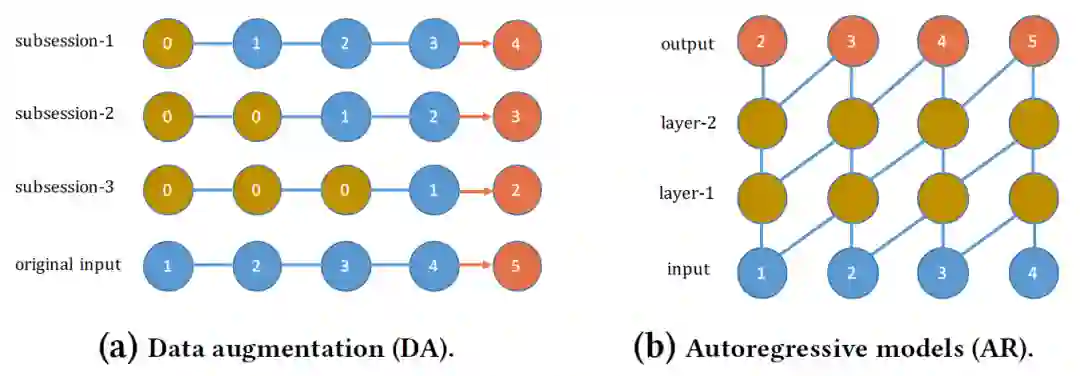 一般来说,从序列数据中训练推荐模型有两种常用的策略:数据扩充和自回归训练。