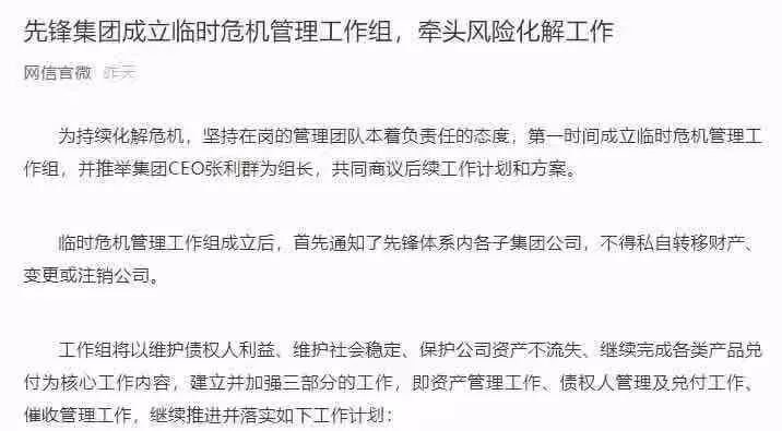 在掌门人辞世后,先锋集团在封锁消息数天后成立了临时危机工作组来处理后续的兑付以及收账问题: