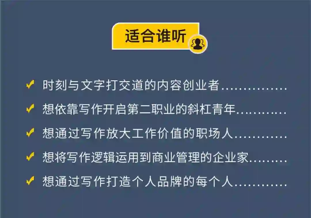 每节课提供2-3个写作技巧,即学即用的写作工具,循序渐进逐一讲解,让你快速掌握写作秘诀。