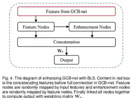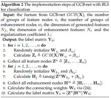 为了提高 GCB-net 的性能,可以使用 BLS 来增强 GCB-net 的特征。首先通过特征映射和增强映射将 GCB 特征扩展到随机的广义空间,然后通过特征节点和增强节点的连接对输出进行预测。GCB-net with BLS 伪代码与示意图如图 5 和图 6 所示。