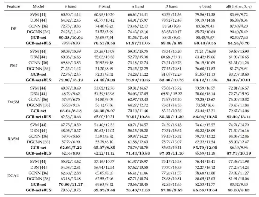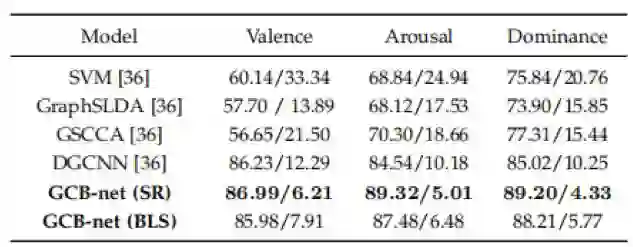 GCB-net with BLS 取得了最好的效果,验证了模型的有效性。DREAMER 数据集实验结果如图 8 所示,可以观察到,大部分方法在 Dominance 维度识别效果较好,虽然 GCB-net+BLS 的性能相对于 GCB-net 并没有得到提升,但其准确性仍优于或接近 DGCNN 的结果,说明了 GCB 模型的有效性。