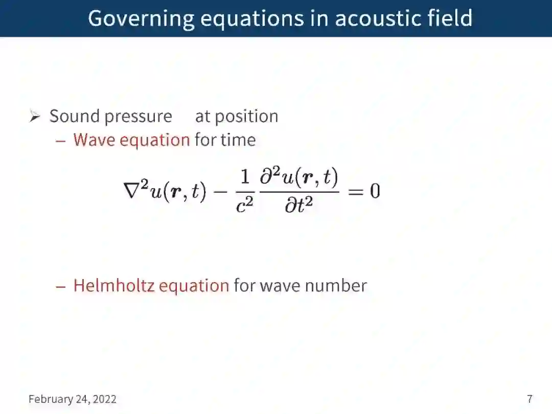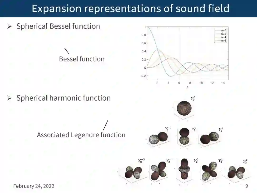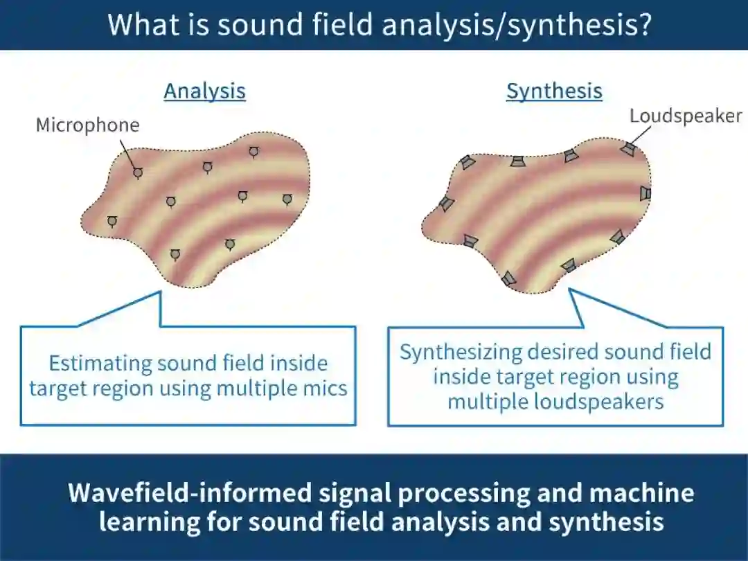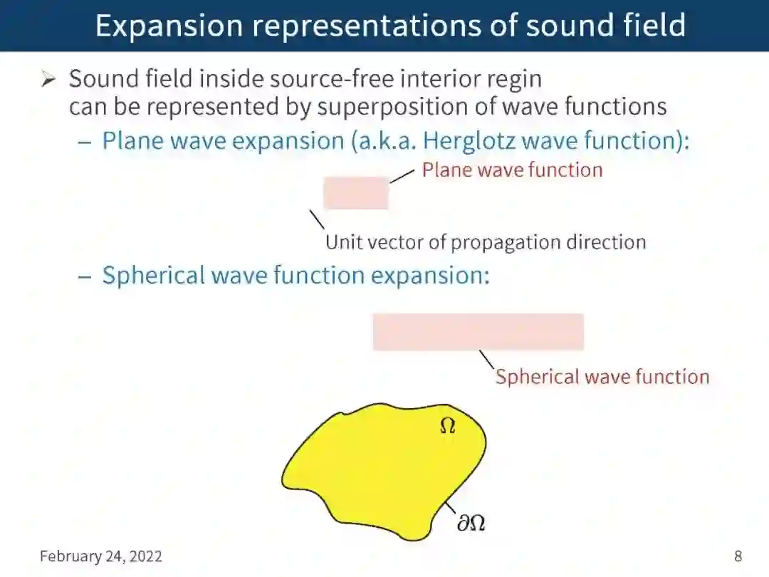 声场估计的研究已有多年。基于波域处理的技术,即即声场的基展开为平面波或球波函数,这是在过去十年中建立的。特别是利用球形传声器阵列进行球形谐波域处理的研究。近年来,波域处理技术已被纳入先进的信号处理和机器学习技术。例如,最近提出了一种基于无限维展开的声场估计方法,它与核方法相对应,并在各种应用中验证了其相对于传统方法的优势。