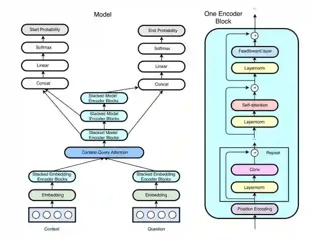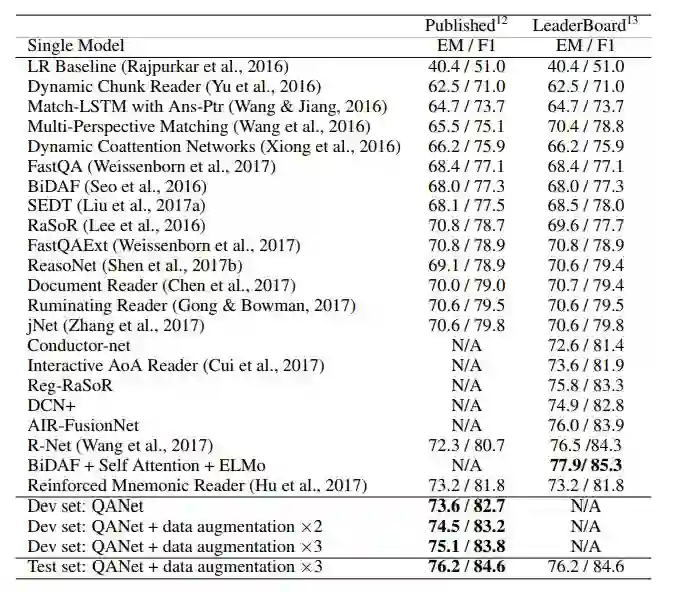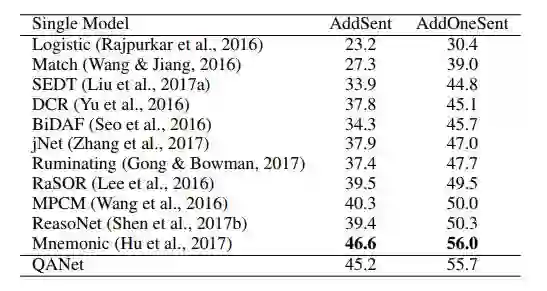 人们对机器阅读理解和自动问答任务的兴趣与日俱增。在过去的几年中,端到端的模型在许多具有挑战性的数据集上显示出非常好的结果,取得了显著的进步。最成功的模型通常会利用两个关键的组成部分:(1)处理序列化输入的循环模型,(2)处理长期交互的注意力组件。Seo 等人(2016)提出的 Bidirectional Attention Flow(BiDAF)模型是这两部分的一个成功组合,该模型在 SQuAD 数据集(Rajpurkar 等人在 2016 年发布)上获得了很好的效果。这些模型有一个缺点,即由于它们的循环性质导致训练和推断都十分缓慢,特别是对于长文本来说。高昂的训练开销不仅导致了很长的实验周期,限制了研究者进行迅速的迭代,还妨碍了模型被用于大型数据集。与此同时,缓慢的推断阻碍了机器阅读理解系统在实时应用中的部署。