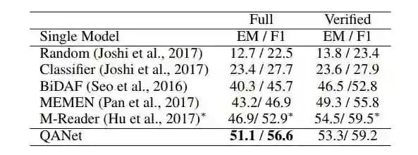 表 7:在 TriviaQA 数据集的 Wikipedia domain 上,不同的单段阅读模型在开发集上的性能。注:*表示测试集的结果。