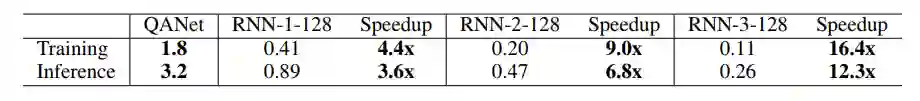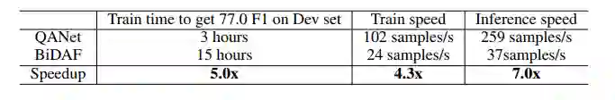 表 4:QANet 模型和 BiDAF 模型(Seo et al., 2016)在 SQuAD 数据集上的速度对比。