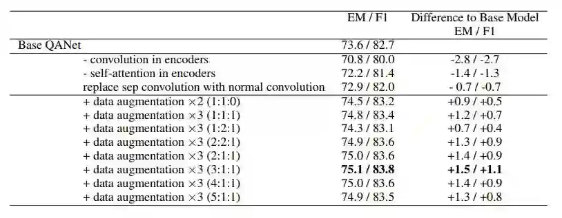 表 5:对数据增强和 QANet 模型中其它部分的模型简化测试。这里所展示的结果是在开发集上取得的。对于包含「data augmentation」条目的行,「×N」表示数据被增大到原始规模的 N 倍,而括号中的比率表示采样率,即原始数据、「英语-法语-英语」和「英语-德语-英语」数据的采样比例。