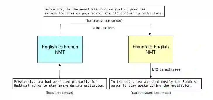 图 2:以法语作为中间语言(以 English-French-English 形式改写)的数据增强过程图示。其中,k 是集束宽度,即 NMT 系统生成的译文数量。