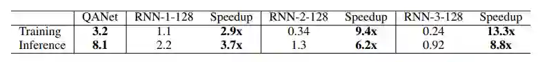 表 8:QANet 模型和基于 RNN 的模型在 TriviaQA 维基百科数据集上的运行速度对比,所有的批大小都是 32。「RNN-x-y」表示一个有 x 个层、每层包含 y 个隐藏单元的 RNN 网络。这里使用的 RNN 是双向 LSTM。处理的速度以「批/秒」这个单位衡量,值越高,速度越快。