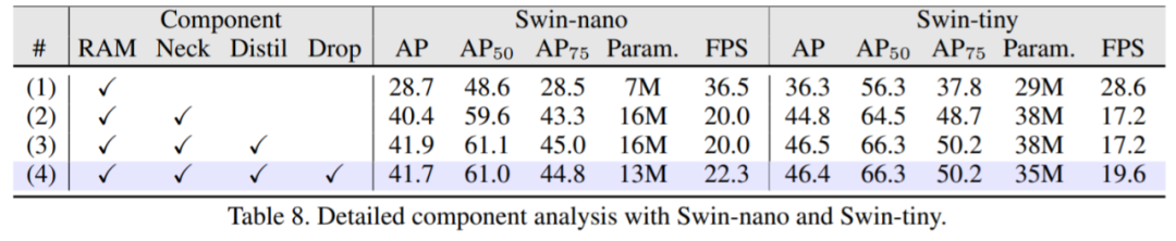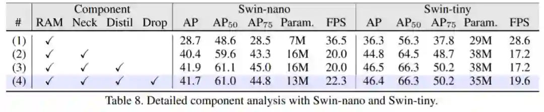 研究者将所有提议的组件结合起来,以实现目标检测的高精度和速度。如表 8 所示,有四个组件:(1) RAM 将 Swin Transformer 扩展为独立的目标检测器,(2) neck 解码器利用多尺度特征和两种辅助技术,(3) 从大模型中获益知识蒸馏,(4) 解码层 drop 进一步加快推理速度。结果表明:当使用 Swin-nano 作为其主干时,它仅使用 13M 参数就达到了 41.7AP 和合理的 FPS。此外,当使用 Swin-tiny 时,它仅损失了 2.7 FPS 而表现出 46.4AP。