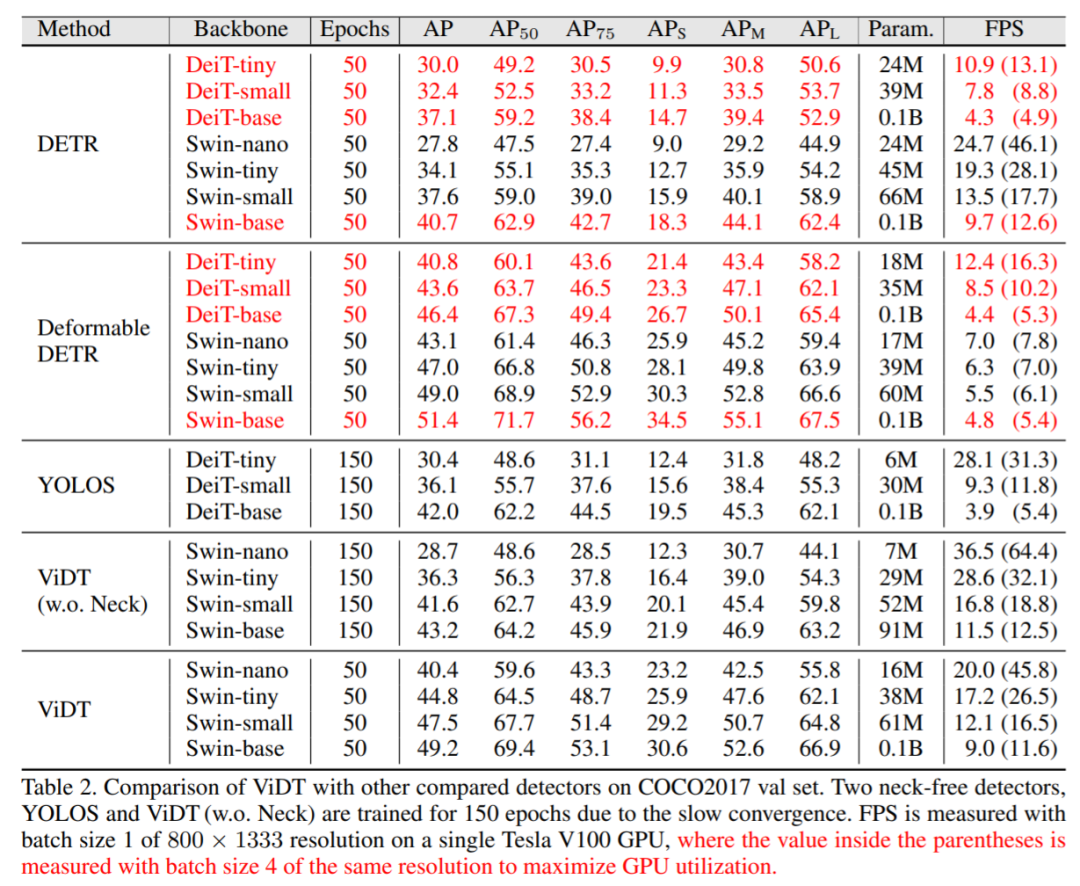 表 2 将 ViDT 与 DETR (ViT) 和 YOLOS 的 AP、FPS 等进行了比较,其中 DETR (ViT) 有两个变体:DETR 和 Deformable DETR。
