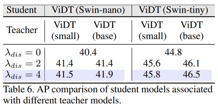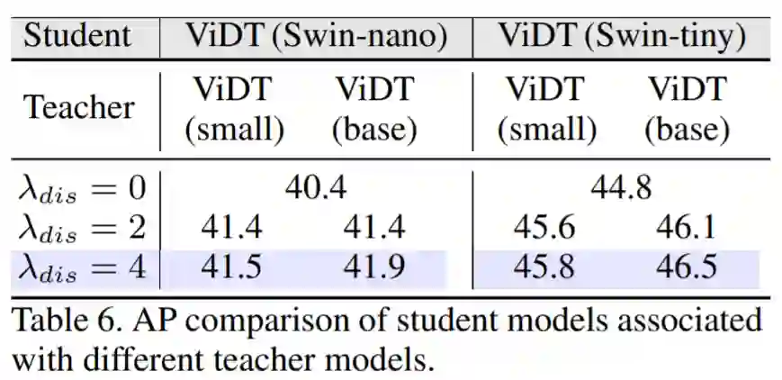 虽然大型模型具有实现高性能的高容量,但在实际使用中它的计算成本可能很高。因此,该研究还提出了一种简单的知识蒸馏方法,可以通过 token 匹配从大型 ViDT 模型中迁移知识。