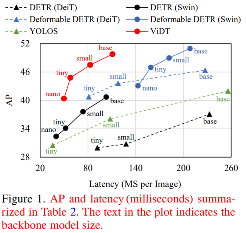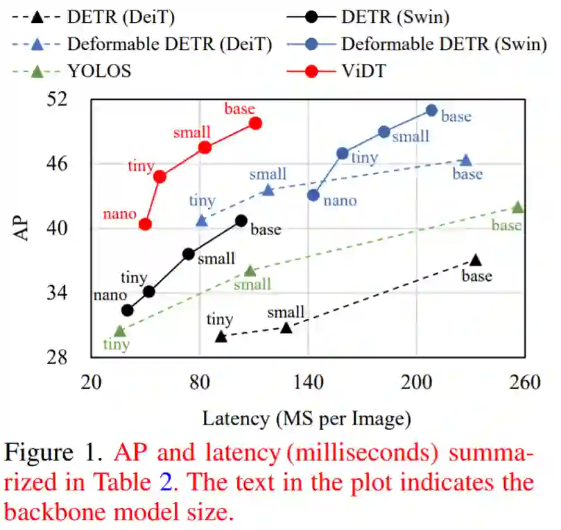 在 Microsoft COCO 基准数据集上的评估表明,ViDT 在现有的完全基于 transformer 的目标检测器中获得了最佳的 AP 和延迟权衡,其对大型模型的高可扩展性,可达 49.2AP。