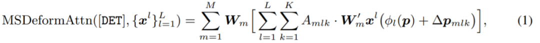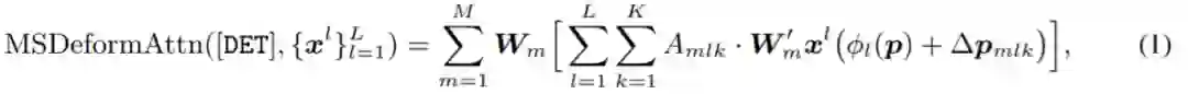 解码器从带有 RAM 的 Swin Transformer 接收两个输入:(1)从每个阶段生成的 [PATCH] token(2)从最后阶段生成的 [DET ] token,如图 2 (c) 的 Neck 所示。在每个可变形的 transformer 层中,首先执行 [DET] × [DET] 注意力。对于每个 [DET] token,应用多尺度可变形注意力以生成一个新的 [DET] token,聚合从多尺度特征图