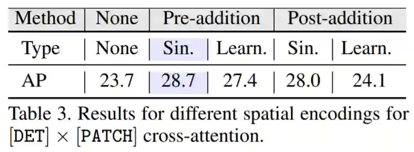 表 3 对比了不同空间位置编码与 ViDT(w.o. Neck)的结果。结果表明:pre-addition 比 post-addition 带来的性能提升更高,即 sinusoidal encoding 优于 learnable 编码;因此,正弦空间编码的 2D 归纳偏置在目标检测中更有帮助。特别是,与不使用任何编码相比,使用正弦编码的预加法(pre-addition)将 AP 增加了 5.0。