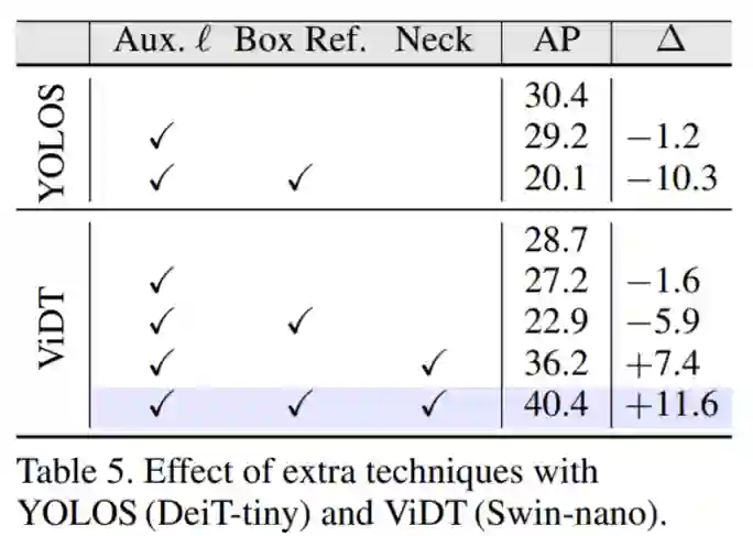 为了彻底验证辅助解码损失(auxiliary decoding loss)和迭代框细化(iterative box refinement)的有效性,该研究甚至对 YOLOS 等 neck-free 检测器进行了扩展。表 5 显示了两种 neck-free 检测器 YOLOS 和 ViDT (w.o. Neck) 性能。实验结果证明在 ViDT 中使用 Neck 解码器来提高目标检测性能是合理的。