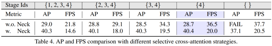 表 4 总结了使用不同选择策略进行交叉注意力(cross-attention)时的 AP 和 FPS,其中 Swin Transformer 总共包含四个阶段。有趣的是,只要在最后阶段激活交叉注意力,所有策略都表现出相似的 AP。由于在各个阶段中以自下而上的方式提取特征,因此在低级别阶段很难直接获得有关目标对象的有用信息。因此,研究者想要获得较高的 AP 和 FPS,只使用最后阶段是最好的设计选择,因为 [PATCH] token 的数量最少。