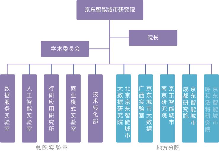 地方分院:北京京东智能城市大数据研究院、京东城市大数据广西实验室、京东智能城市南京研究院、京东智能城市成都研究院、京东智能城市呼和浩特研究院。
