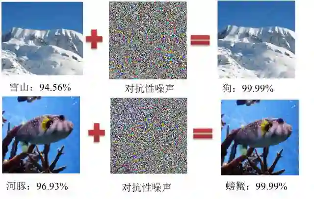 对抗样本是指攻击者通过向真实样本中添加人眼不可见的噪声,导致深度学习模型发生预测错误的样本,如下图所示:给定一张图片(雪山或河豚),攻击方给图片添加了微小的扰乱,尽管人眼很难发觉,但是模型却高概率的将其误分(狗或螃蟹)。