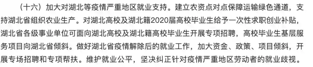 保障失业人员基本生活,4月底前实现线上申领失业保险金。加大对湖北等疫情严重地区就业支持,对湖北高校及湖北籍2020届毕业生给予一次性求职创业补贴,湖北省各级事业单位可开展专项招聘,基层服务项目向湖北倾斜。