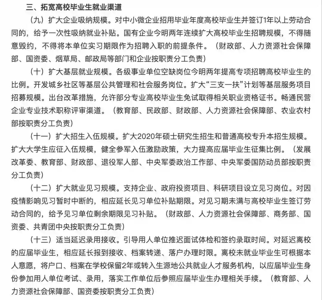 ③扩大2020年硕士研究生招生和普通高校专升本招生规模。扩大大学生应征入伍规模。