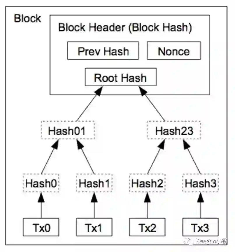 其中,Tx0 ~ Tx3 表示每一笔交易数据,Hash0 则是 Tx0 这笔交易数据的哈希指针,Hash01 则是 Hash0 + Hash1 的哈希指针,这样层层叠加上去,得到最后的Root Hash。从图中也可以看出,从Hash0 到 Root Hash 是一个三层的二叉树,由于这颗树的所有节点都是 Hash 值,所以也称为 Hash Tree,但更专业的名称叫Merkle Tree。不过 Merkle Tree 不一定是二叉树,也可以是多叉树。Merkle Tree 的叶子节点(即Hash0 ~ Hash3)是数据块的 Hash 值,而非叶子节点的 value 则是根据下面的叶子节点的 Hash 值串联起来后再计算 Hash 得出的。通过 Merkle Tree 结构,底层的每一笔交易也都无法篡改,一旦篡改,Root Hash 就会不一致。