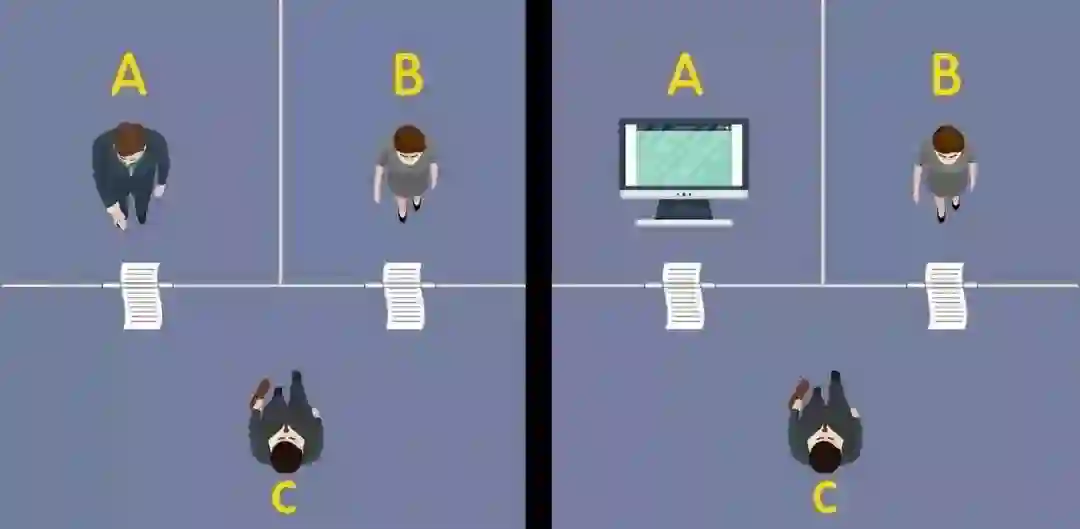 图灵测试的基础是“模仿游戏”。假定在游戏中有三个人(如下图):男A、女B,以及询问者C。C独自呆在一个房间中,C与A、B的交流只能通过两个连接A、B所在房间的传真机来完成。C需要通过和A 、B进行对话,判断他们哪个是男人、哪个是女人。A的目的是模仿女人,尽量扰乱C的判断;B的目的是尽量让C相信自己是个女人。